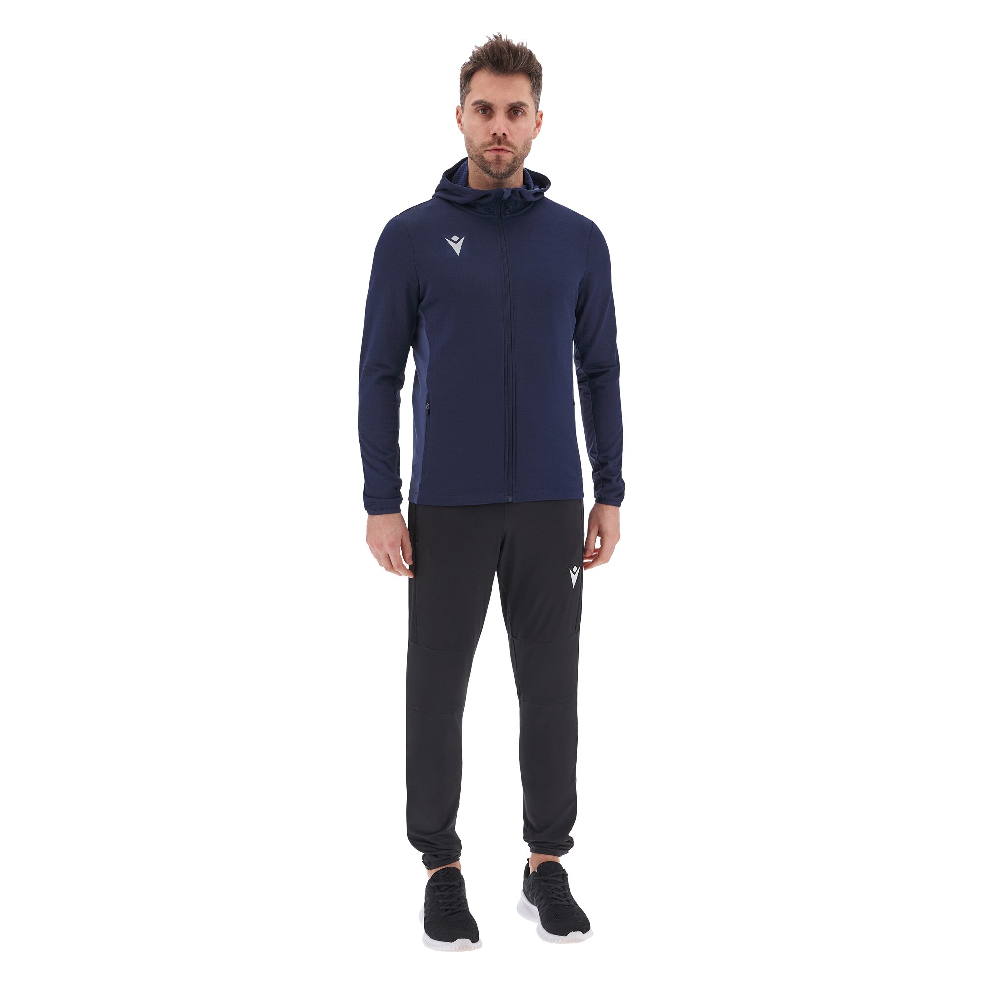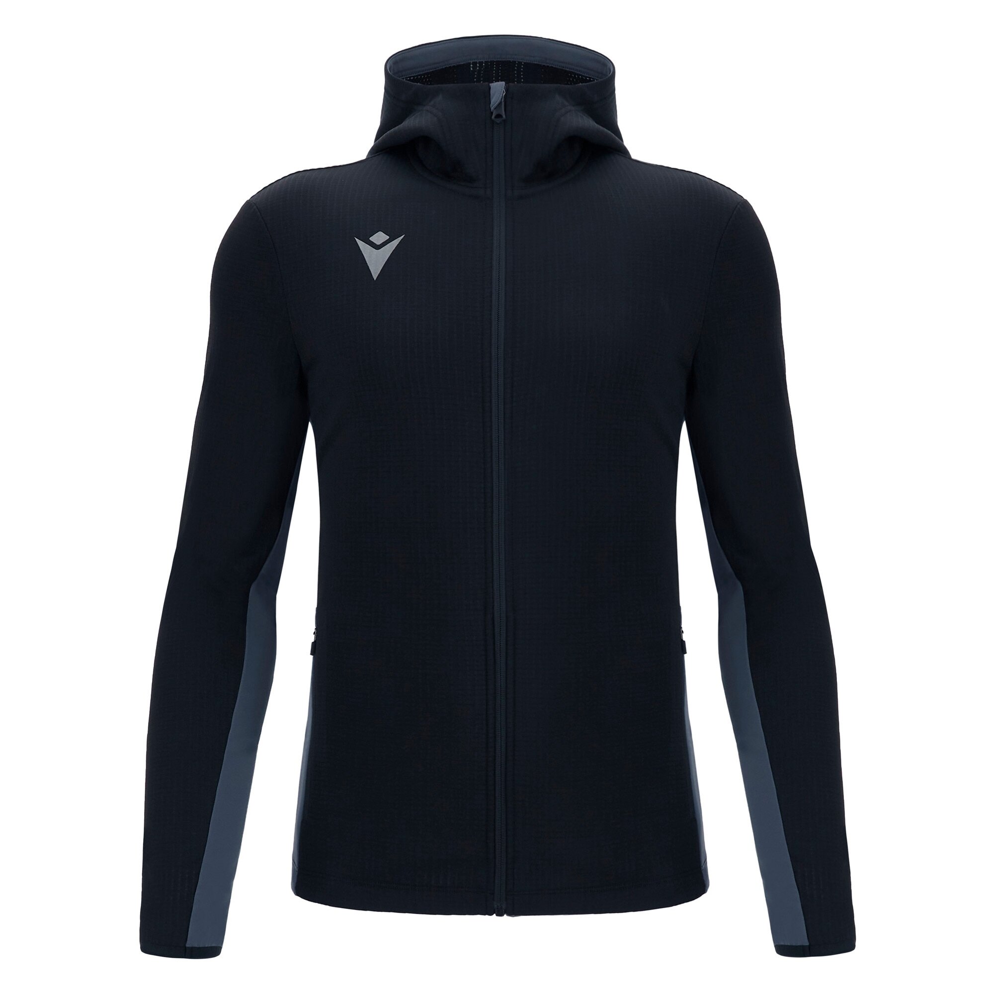 Fermoar frontal complet (full zip) inversat (ascuns) cu cursor autoblocant, Buzunare cu fermoar inversat (ascuns) cu cursor autoblocant, Inserții laterale și sub mânecă din material elastic (stretch), Bandă de protecție la gât (salvacollo).